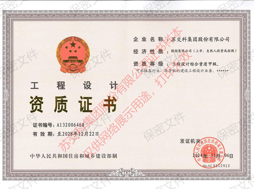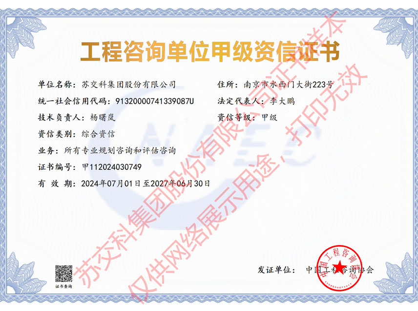 蘇交科擁有工程行業(yè)各領(lǐng)域甲級資質(zhì),包括城鄉(xiāng)規(guī)劃甲級資質(zhì);工程咨詢綜合甲級資質(zhì);工程咨詢專業(yè)甲級資質(zhì)(公路、生態(tài)建設(shè)和環(huán)境工程、水文地質(zhì)、工程測量、巖土工程、城市規(guī)劃、鐵路、城市軌道交通、港口河海工程、市政公用工程(市政交通、給排水)、水利工程、旅游工程);工程設(shè)計綜合甲級資質(zhì);工程勘察綜合類甲級資質(zhì);測繪甲級資質(zhì);公路工程和市政公用工程總承包一級資質(zhì);公路工程、水運工程、市政公用工程監(jiān)理甲級資質(zhì);公路工程甲級、公路工程交通工程專項、水運工程材料甲級和水運工程結(jié)構(gòu)甲級試驗檢測資質(zhì)。
